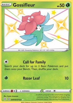 Gossifleur er et charmerende Shiny Vault Pokémon kort fra Shining Fates sættet Kortet har et roligt og naturinspireret shiny artwork som gør det populært blandt samlere af Shiny Pokémon og Grass type favoritter